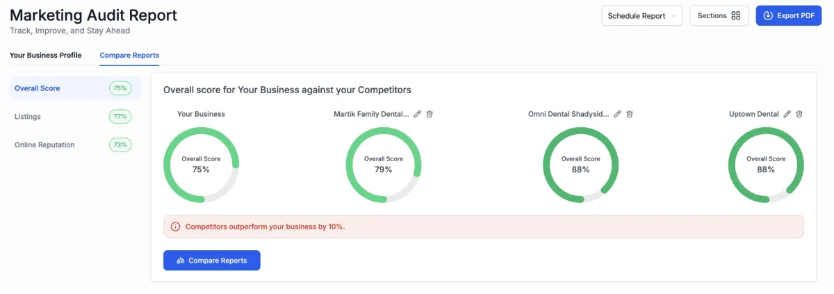 Beyond performance metrics, we evaluate your online reputation, monitoring reviews, mentions, and brand sentiment across social platforms and search results. This helps identify perception gaps, customer feedback trends, and opportunities to strengthen trust and brand credibility.
